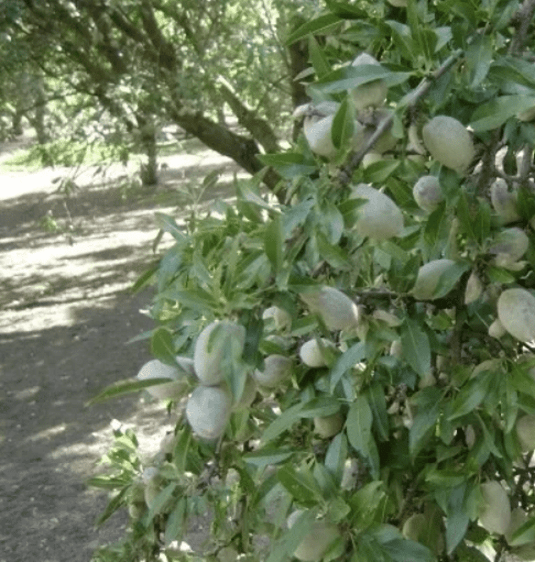 Still on Bill’s land, but across the road, are almonds, almost ready for harvest. They are dearer to grow, with annual costs of $6,250/ha, and establishment costs of $12,500/ha. They take four years to fruit. 80% of the world’s almonds are produced in Central California where 283,000 ha are grown by 6,000 growers. California’s Central Valley mirrors that of a Mediterranean climate; cool, wet winters and warm, dry summers which are ideal for almond growth, provided the almond trees have access to water. Almonds are watered on a 14 day flood rotation, with the trees needing 270 litres per day, (walnuts use 450 l/day).